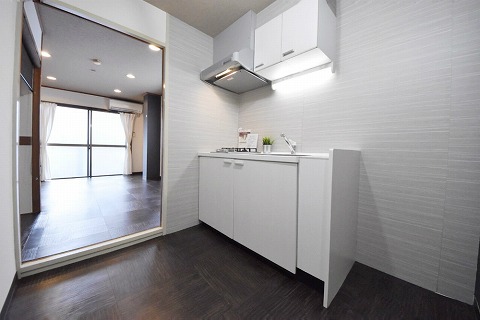 コンロは2口タイプガスコンロ(2口タイプ)シングルレバー水栓のシステムキッチンを採用、レンジフードも掃除しやすい精流板付きです。